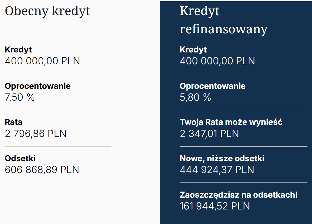 To pokazuje, że przy obecnych warunkach rynkowych refinansowanie kredytu może znacząco obniżyć zarówno bieżące obciążenie budżetu, jak i całkowity koszt kredytu.